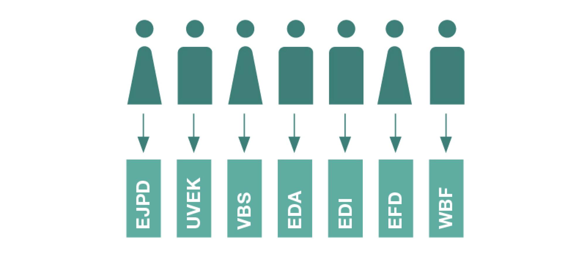 Der Bundesrat leitet die Bundesverwaltung mit ihren rund 40'000 Mitarbeitenden. Sie ist in sieben Departemente gegliedert. Jedes Mitglied des Bundesrats steht einem Departement vor.