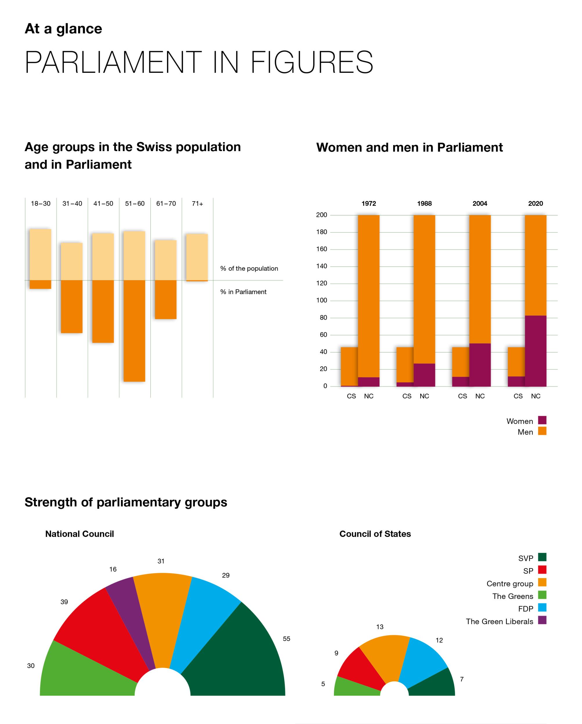 Switzerland’s Parliament or legislature consists of two chambers, which although they have equal powers are very different in their own way: the people’s representatives sit in the National Council, the large chamber, and the representatives of the cantons sit in the Council of States, the small chamber. When sitting together in joint session, they constitute the United Federal Assembly. The 246 members of Parliament represent the interests of the different language communities, political parties, world views and regions in Switzerland.