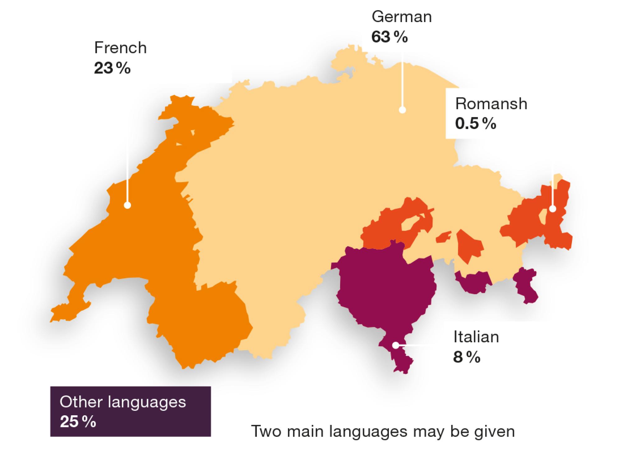 Switzerland is a multilingual country. There are four national languages: German, French, Italian and Romansh. 63 per cent of the population speak primarily (Swiss) German, 23 per cent French, 8 per cent Italian and 0.5 per cent Romansh. English, Portuguese, Albanian (3 to 5 per cent of the population) and various other languages are also spoken in Switzerland. Many people state that they have two main languages.