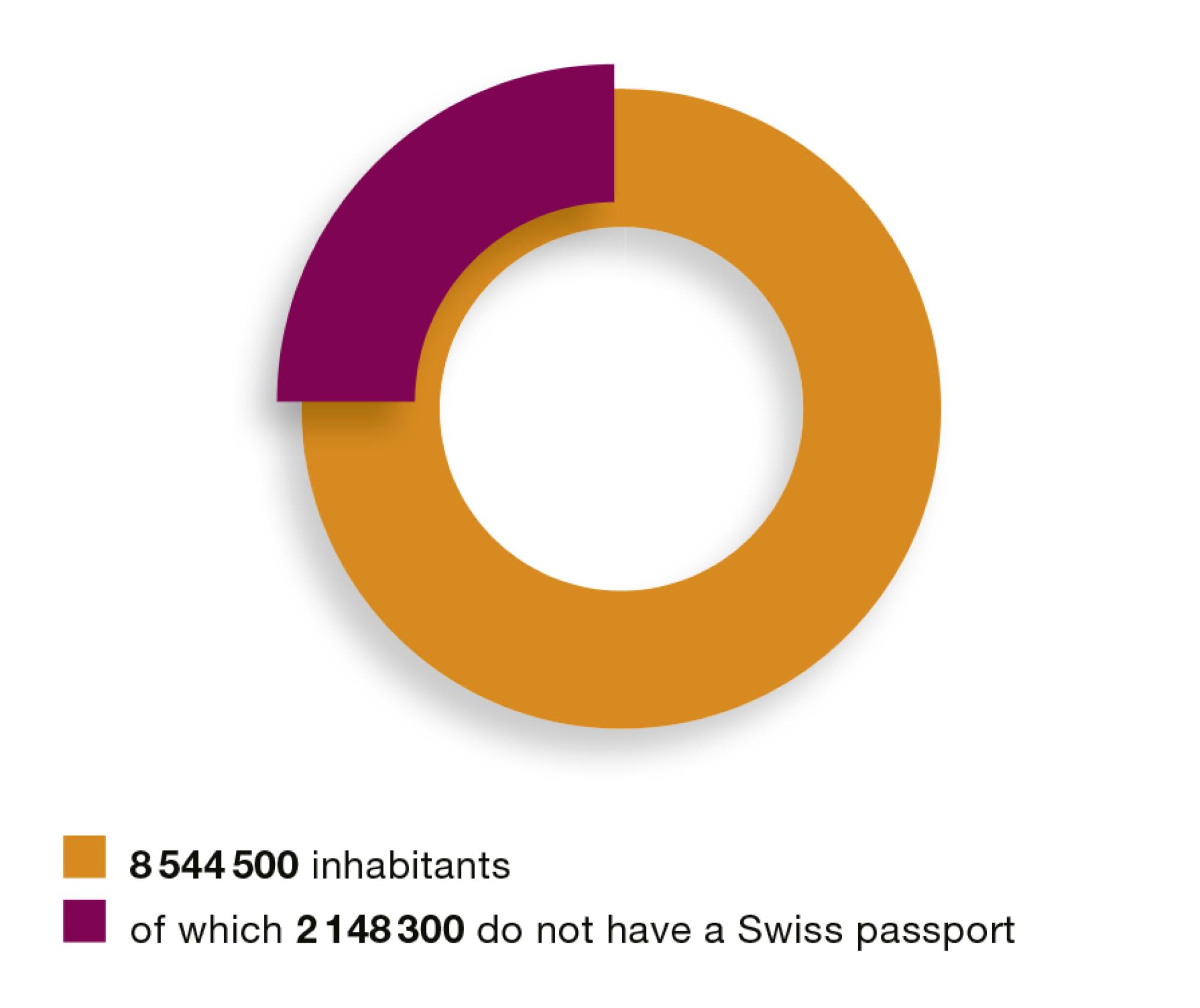 There are approximately 8.5 million people living in Switzerland, 25 per cent of whom are foreign nationals. More than half of the inhabitants who do not have a Swiss passport were either born in Switzerland or have been living here for at least ten years. The majority of foreign nationals come from an EU or EFTA country, predominantly from Italy (15%), Germany (14%) and Portugal (12%). 17 per cent come from non-European states.