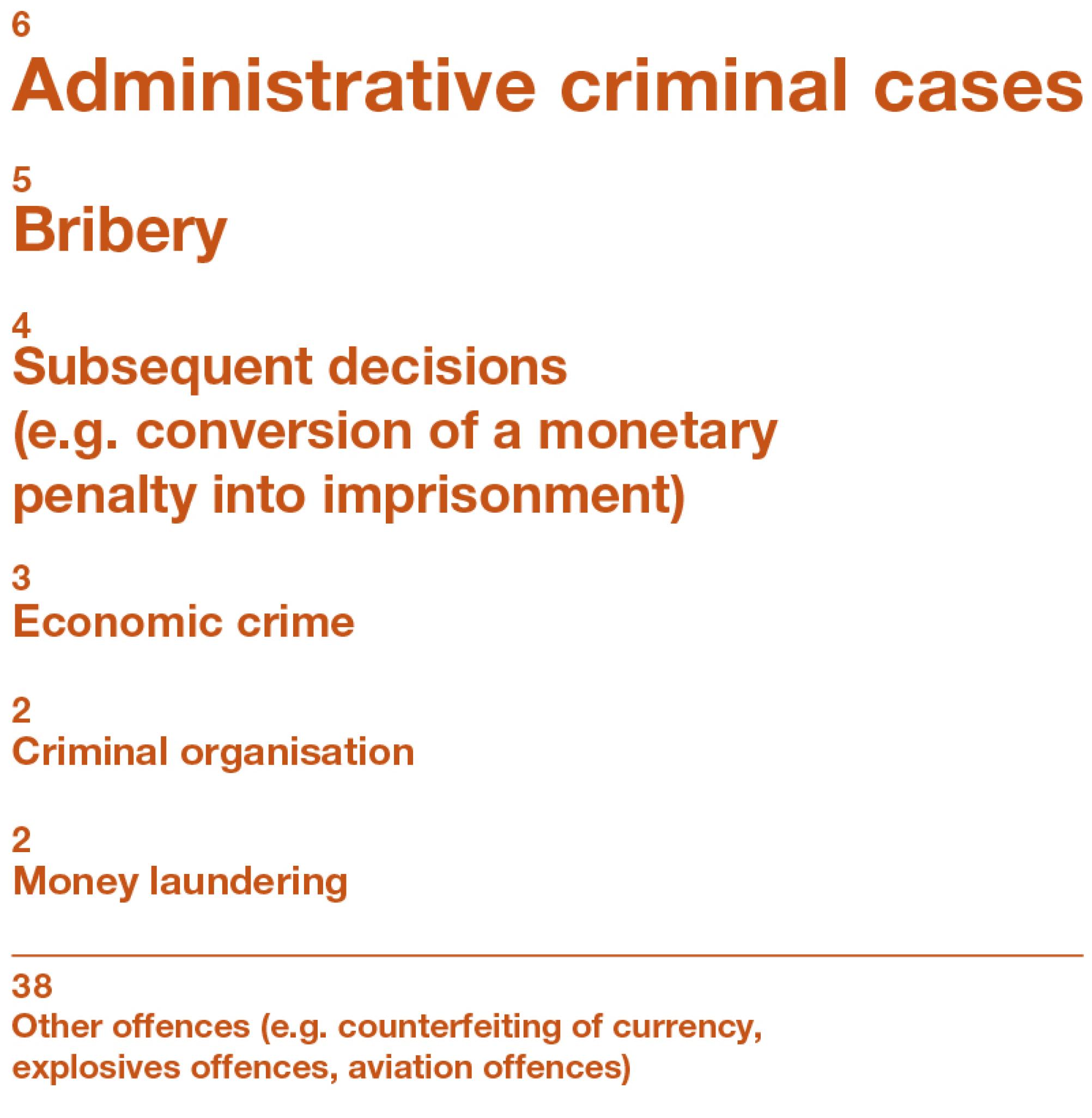 Most criminal offences are judged by cantonal courts. The Federal Criminal Court rules on criminal cases of particular interest to the Confederation, including criminal offences committed by or against federal employees, offences involving explosives, counterfeiting, cross-border economic crime, organised crime, corruption and money laundering as well as aviation offences.