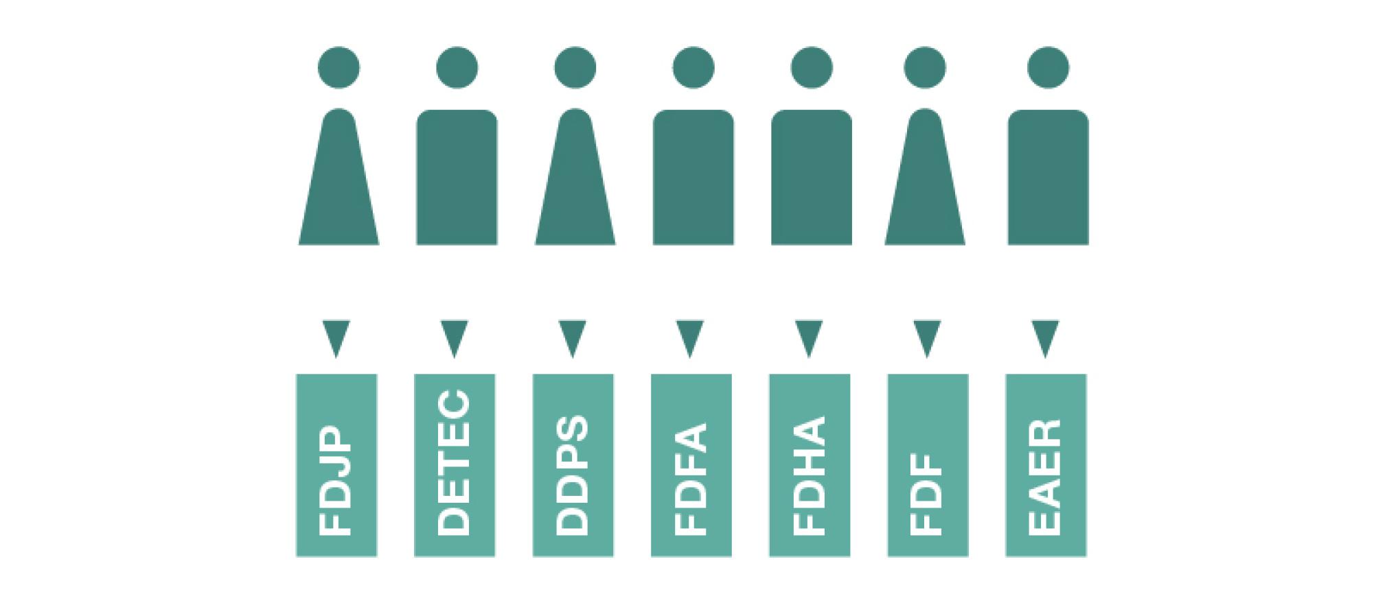 The Federal Council is in charge of the Federal Administration, which has around 40,000 employees. The Administration is organised into seven government departments. Each member of the Federal Council is the head of a department.