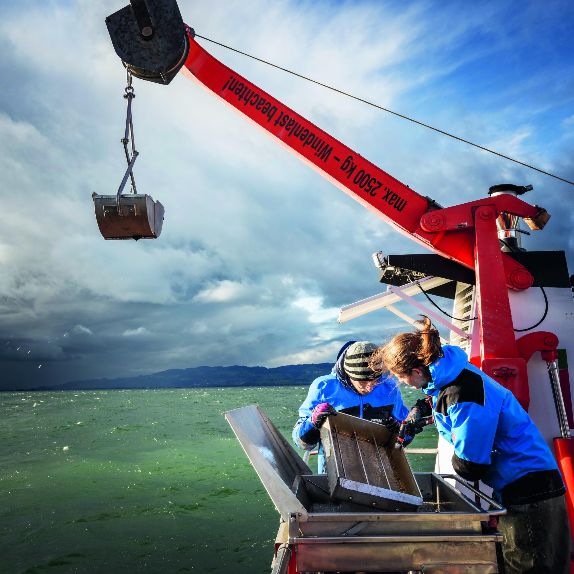 This clamshell bucket, suspended from a crane, is used to collect sediment samples from 55 sites in Lake Constance, which are then rinsed, sieved and examined for quagga mussels.