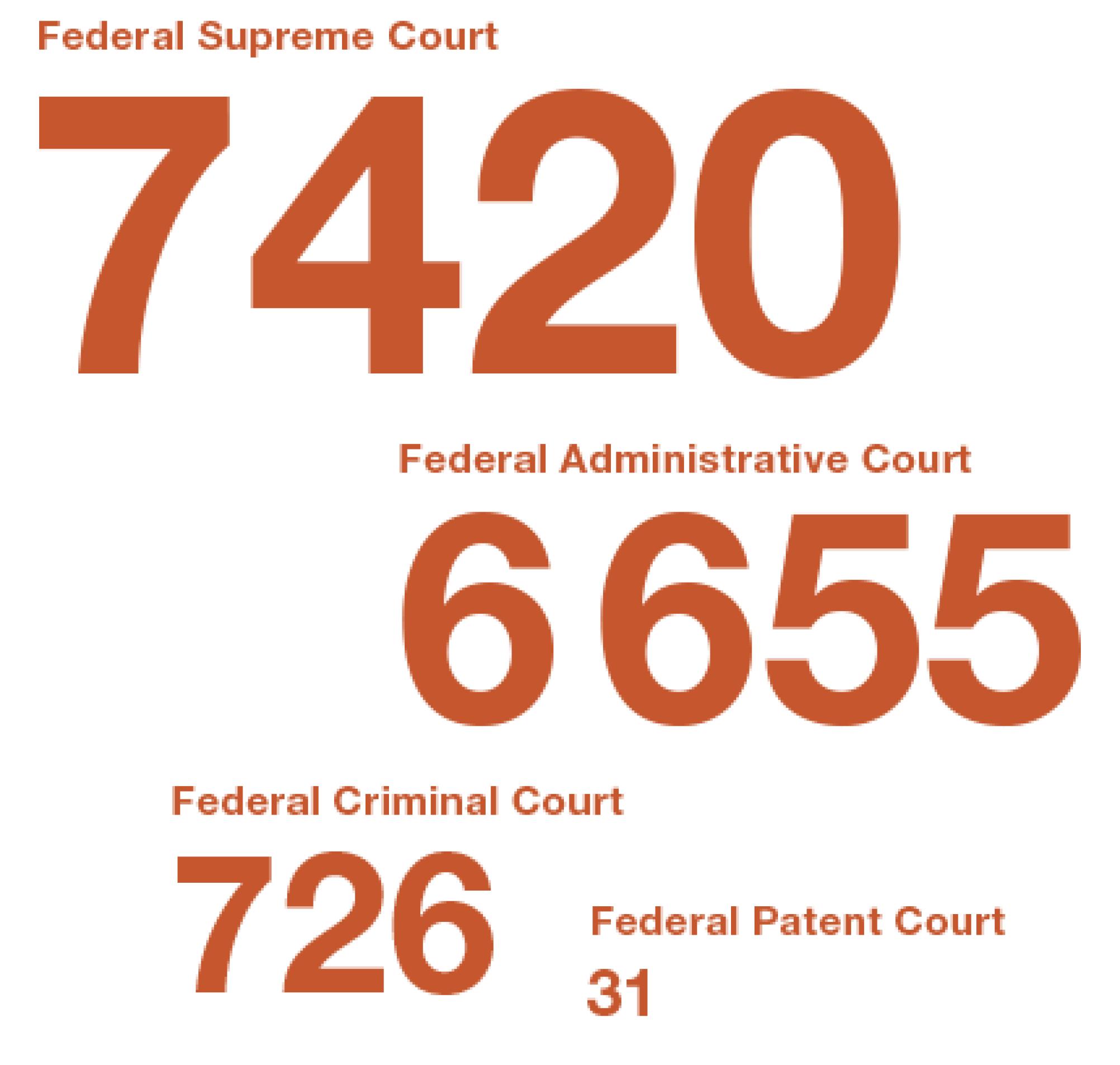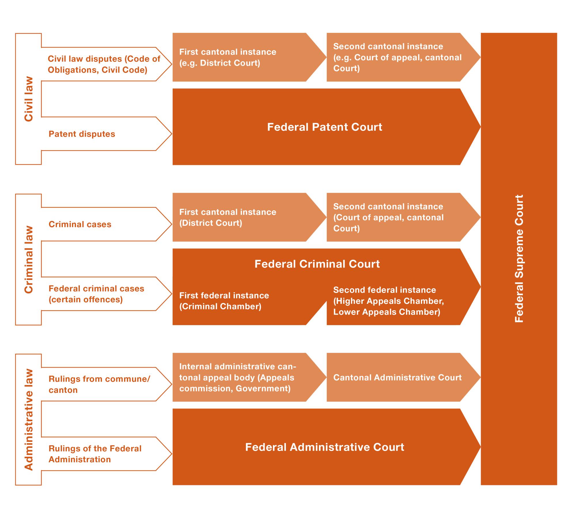 There are four federal courts. The highest court is the Federal Supreme Court, which rules in the final instance on cases from almost all areas of law. The three federal courts of first instance have different tasks. The Federal Criminal Court is responsible for criminal matters of particular importance to the Swiss Confederation as well as for appeals concerning international mutual assistance in criminal matters. The Federal Administrative Court rules on appeals against rulings of the federal administrative authorities and the Federal Patent Court on disputes over invention patents.