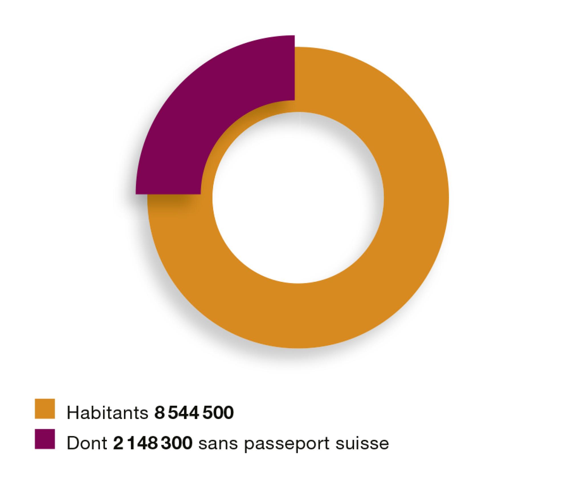 La Suisse compte 8,5 millions d’habitants. 25 % d’entre eux sont des étrangers. Plus de la moitié des personnes n’ayant pas le passeport suisse sont nées en Suisse ou y vivent depuis au moins dix ans. La plupart de la population étrangère provient d’un pays de l’UE ou de l’AELE. Les Italiens (15 % des étrangers), les Allemands (14 %) et les Portugais (12 %) représentent la part la plus importante. 17 % des étrangers proviennent d’États non européens.