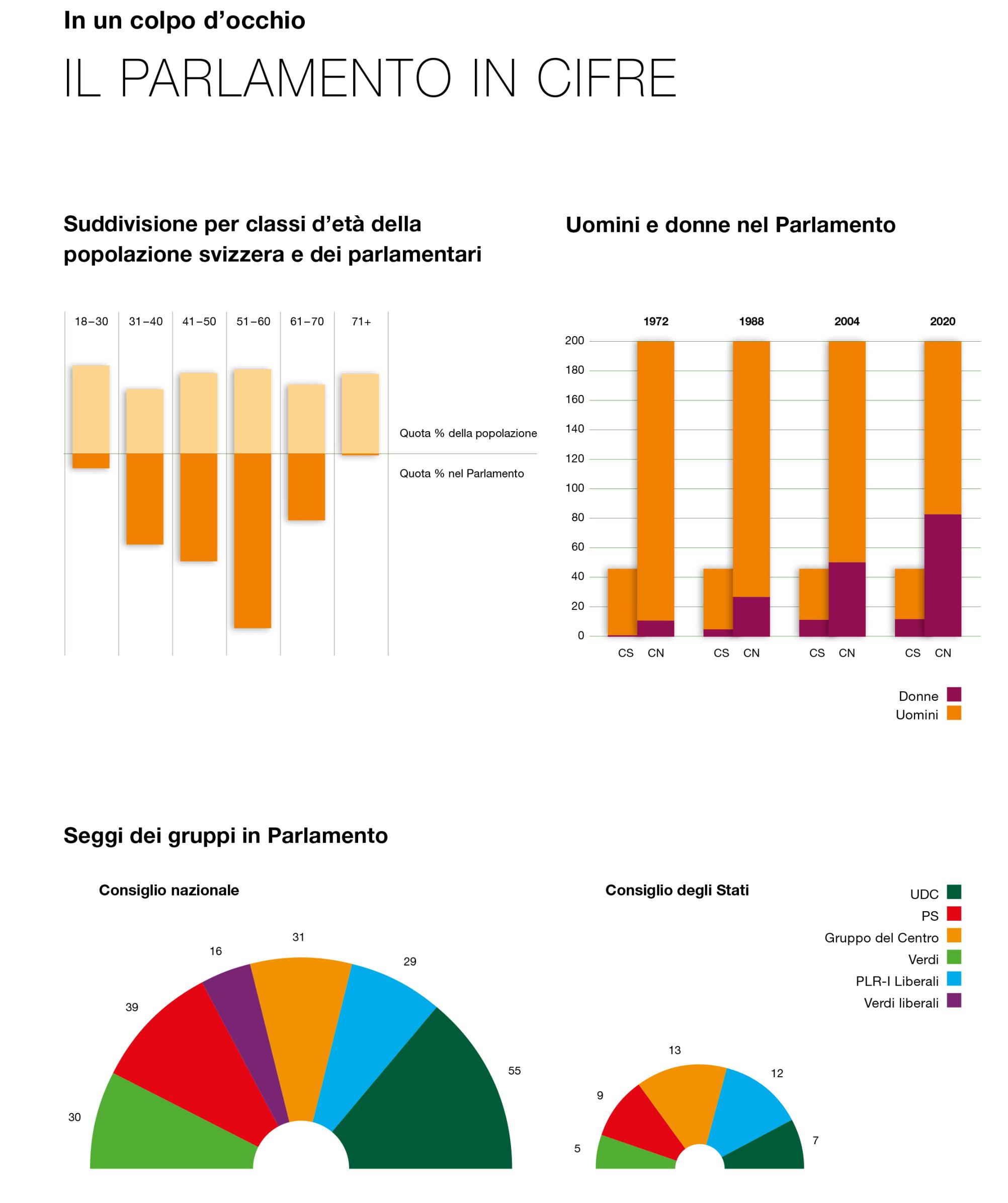 Il Parlamento svizzero, l’organo legislativo, è costituito di due Camere che, pur essendo equiparate, hanno caratteristiche diverse: nel Consiglio nazionale – la Camera bassa – siedono i deputati del Popolo e nel Consiglio degli Stati – la Camera alta – siedono i rappresentanti dei Cantoni. Assieme queste due Camere formano l’Assemblea federale plenaria. I 246 membri del Parlamento rappresentano le diverse comunità linguistiche, i vari partiti, interessi, convinzioni e regioni del nostro Paese.