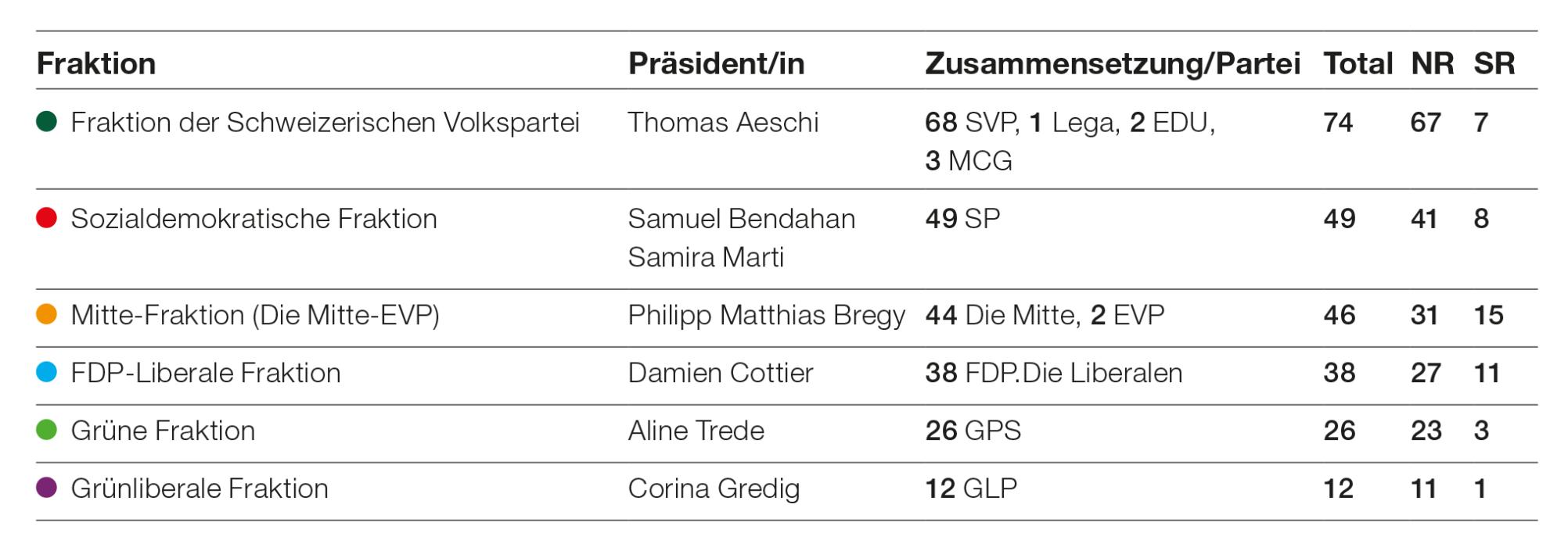 Im Nationalrat ist die Zugehörigkeit zu einer Fraktion besonders wichtig, denn sie ist Voraussetzung für den Einsitz in einer Kommission. Je grösser eine Fraktion ist, desto mehr Kommissionssitze stehen ihr zu und desto grösser ist ihr Einfluss im Parlament. Im Ständerat hingegen spielen die Fraktionen weniger eine Rolle.